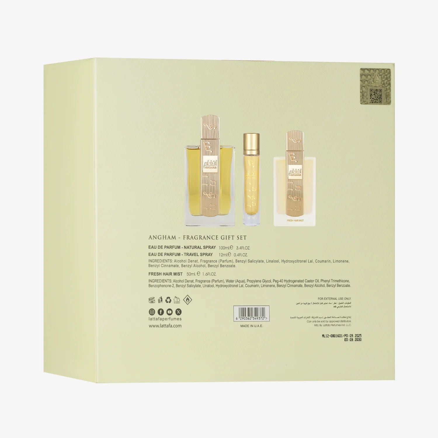 LATTAFA ANGHAM 3 PCS GIFTSET WITH 100ML EDP + 12ML TRAVEL SPRAY + 50ML HAIRMIST